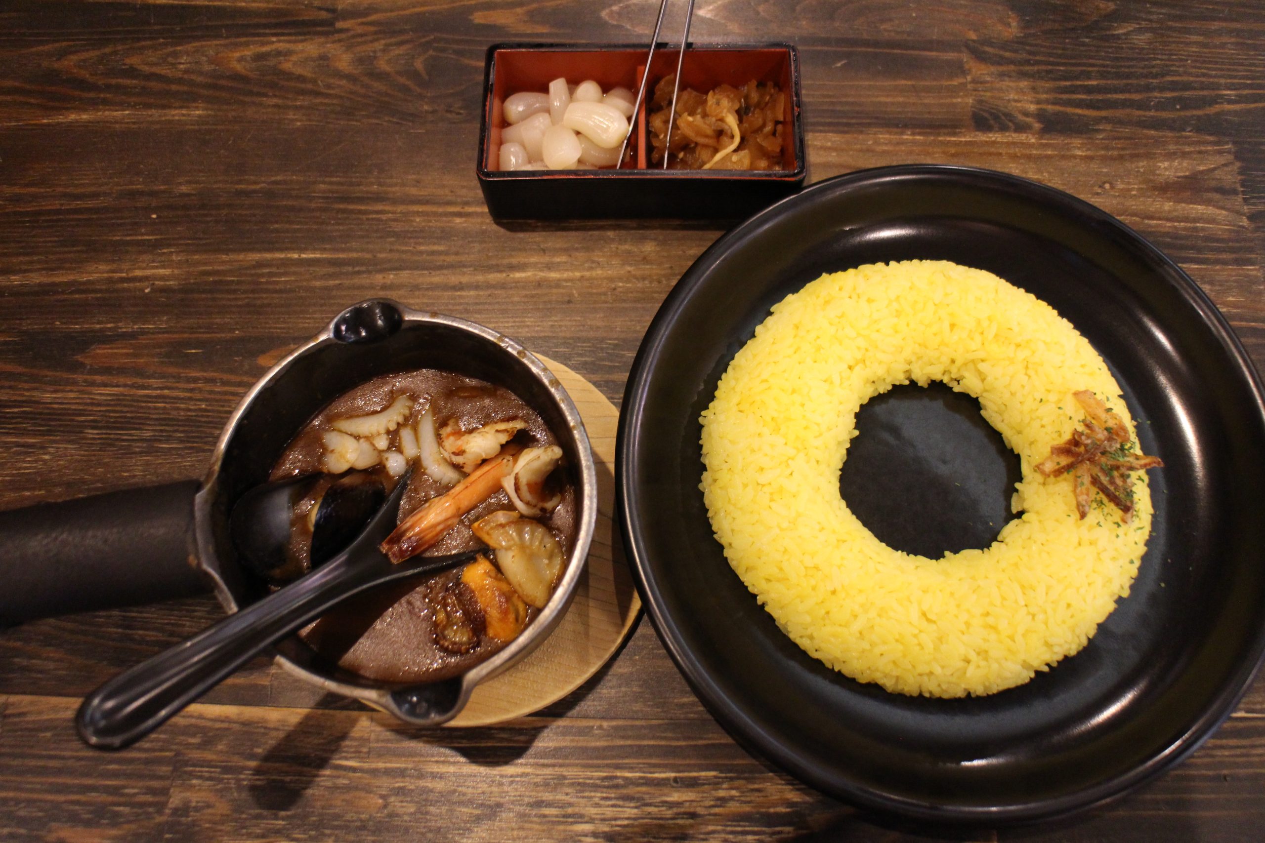 ドーナツ状にぽっかり空いたターメリックライスの中に、鉄鍋でぐつぐつ煮込んで熱々のカレーを流し込むスタイルです。辛さは3段階から選ぶことができるので、お子さまでも安心して召し上がって頂けます。
