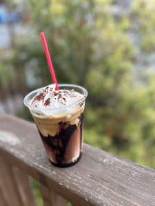 バンホーテンココアで作った自家製チョコレートシロップをたっぷりかけて、ミルク、エスプレッソ、仕上げにホイップをのせたオトナカフェ。