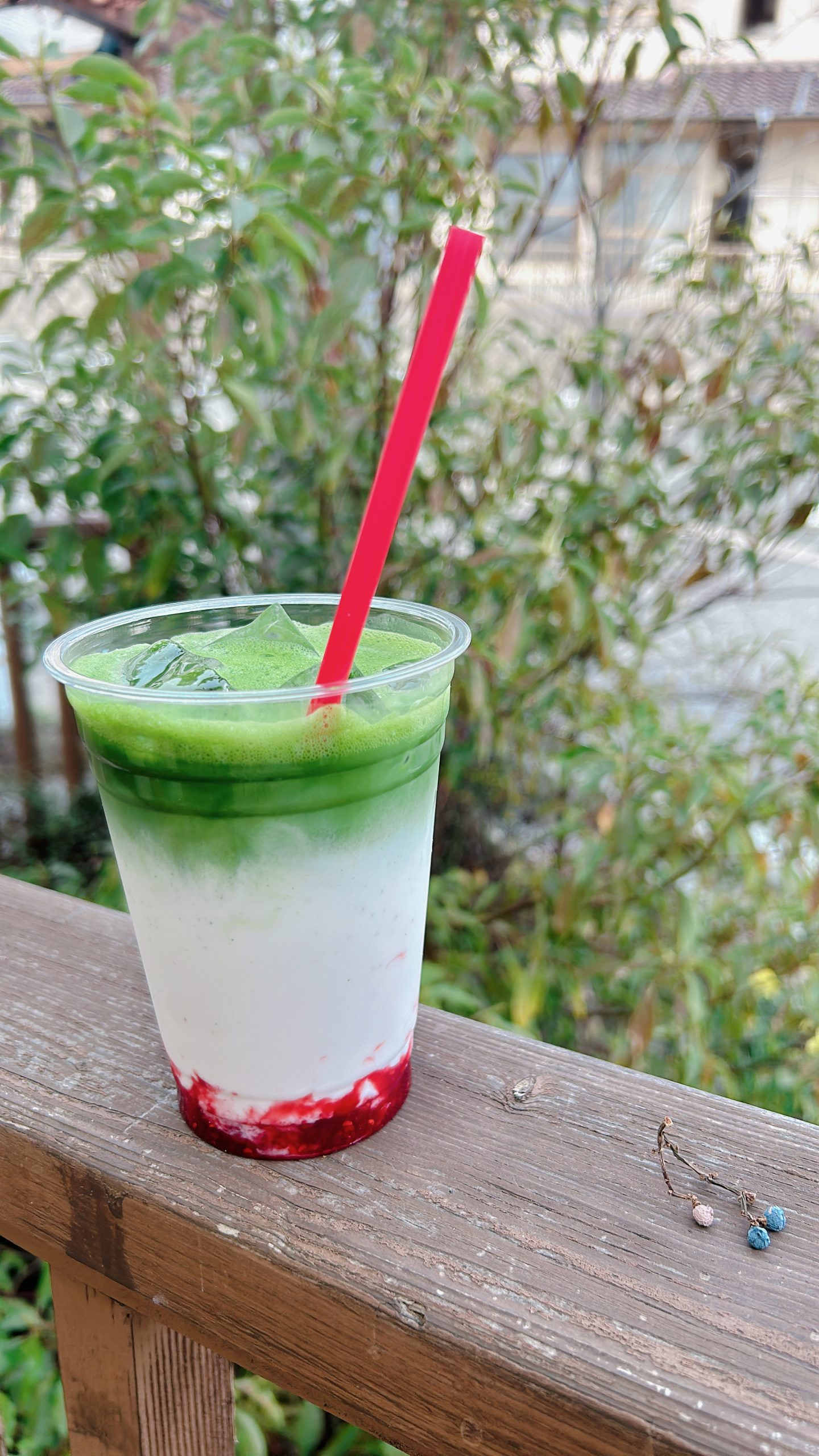 自家製いちごシロップに冷たいミルク。その上に平野園さんの濃厚抹茶をプラス。いちごの爽やかな酸味と抹茶の昔話をお楽しみください。