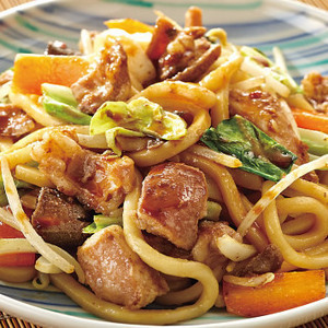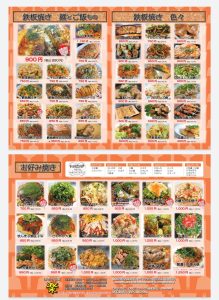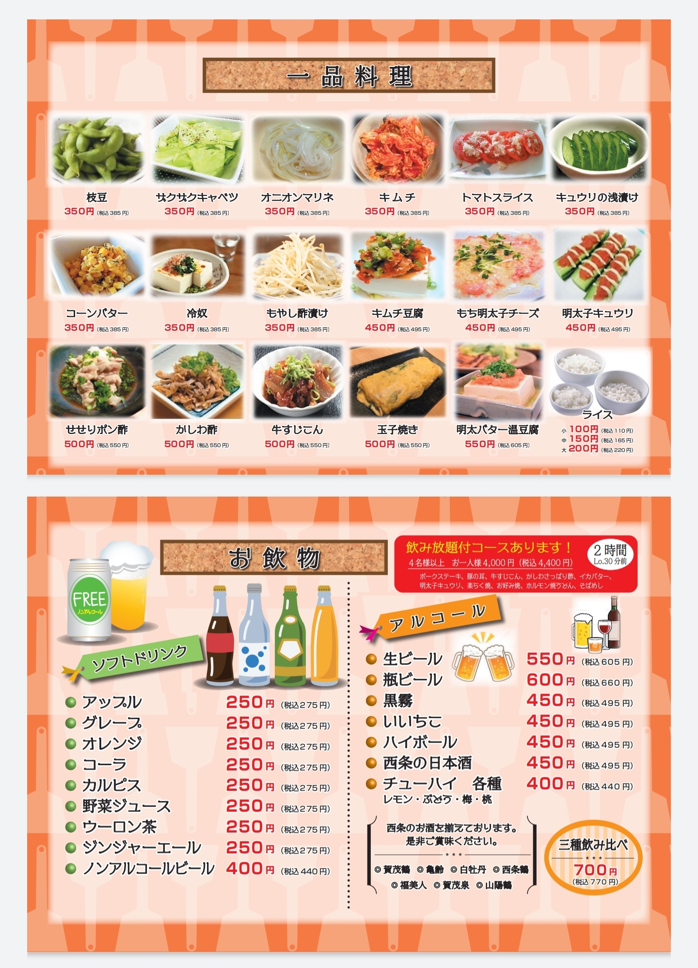 ポークステーキ、イカバター、牛すじこん、かしわ酢、枝豆、豚の耳、明太子キュウリ、お好み焼き、そばめし、楽らく焼き、ホルモン焼きうどんの11品に、