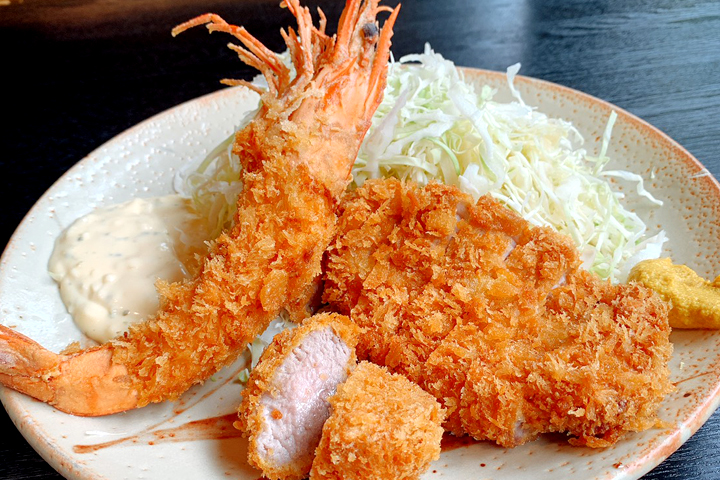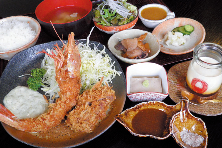 「しなの」名物ジャンボ海老フライは、創業時から変わらない味とボリューム満点の食べ応え。