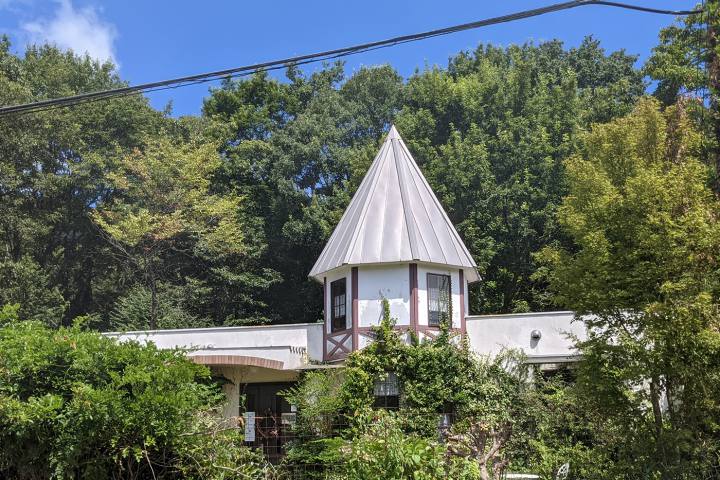 木の間からのぞく三角屋根が目印です。