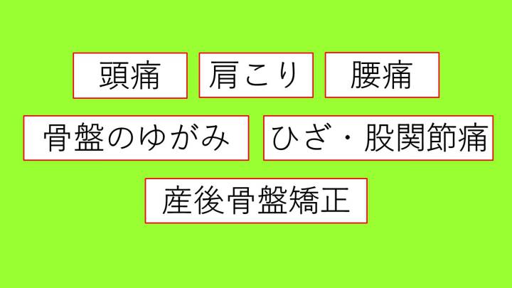 「頭痛」「肩こり」「腰痛」「骨格のゆがみ」「ひざ・股関節痛」「産後骨盤矯正」…