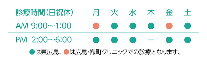 クリニックは東広島市内と広島市内の2カ所 ご都合に合わせてご予約下さい。