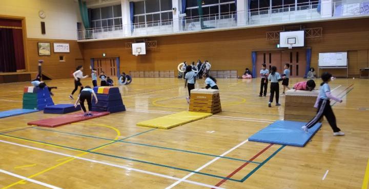 体操と新体操の教室があり、体操ではマット、跳び箱、縄跳びなどを使って体を動かします。
