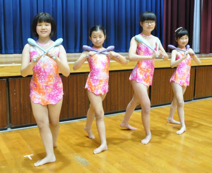 幼児(3歳~)、低学年、高学年に分かれ、 基礎となる柔軟、マット運動などを取り入れながら、 フープやリボンなどの手具を使って練習します。 発表会などのイベントで、多くの皆さんに感動してもらえる演技ができるよう、 頑張って練習しています。