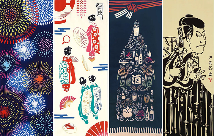 歳時記、花、動物、酒、浮世絵、歌舞伎など様々なモチーフで楽しいデザインがいっぱい!職人技によるにじみが趣きを添えます。ハンカチ、敷物、タペストリーなど生活の様々な用途に使ってください。