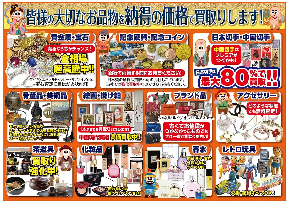 貴金属・宝石・記念硬貨・記念コイン・日本切手・中国切手・骨董品・絵画・掛け軸・ブランド品・ブランド時計・アクセサリー・茶道具・お酒・香水・化粧品・レトロおもちゃの買い取りを行います。