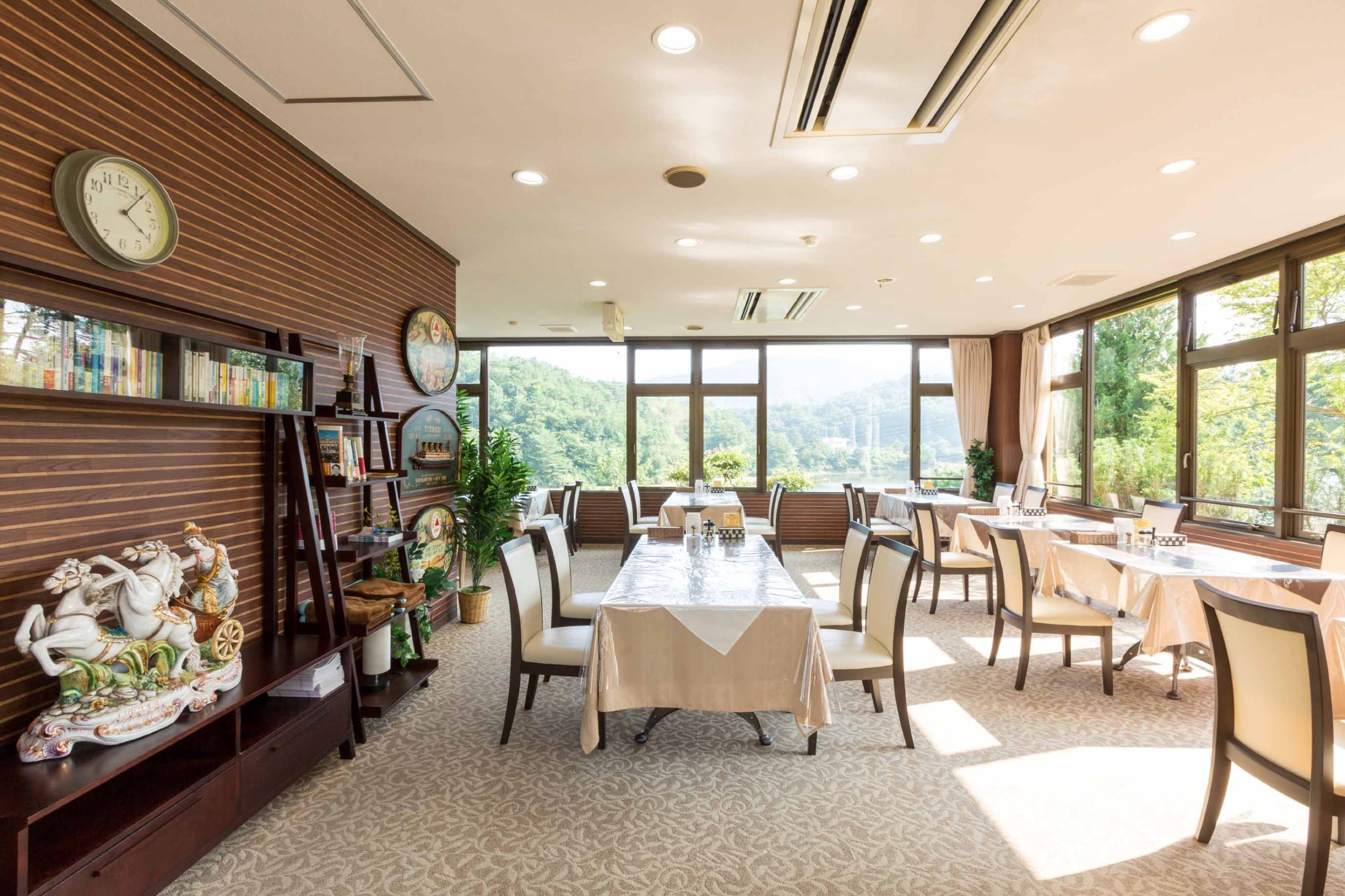 美しい景色が楽しめる開放感あふれる空間です。湖畔の四季を満喫しながらお食事をどうぞ。