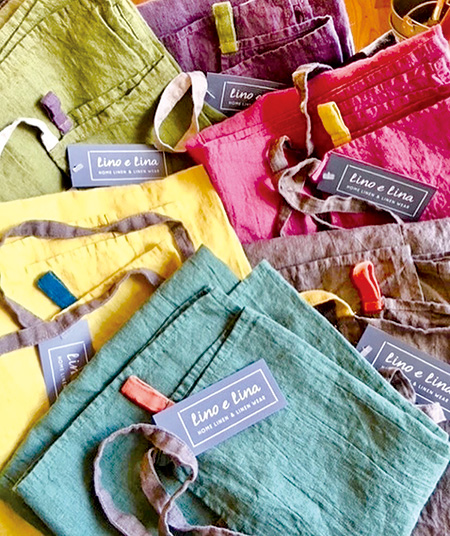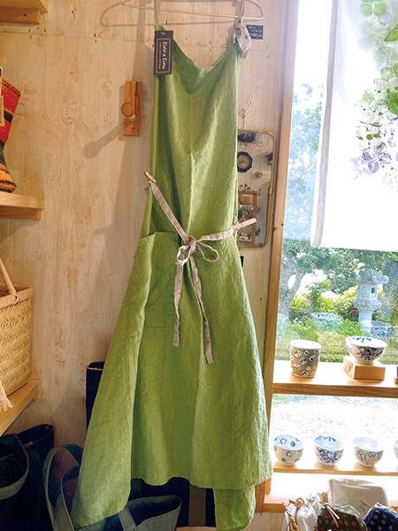 洗濯機で洗っても丈夫なリネンのエプロン。使うほど柔らかく味が出てくる。