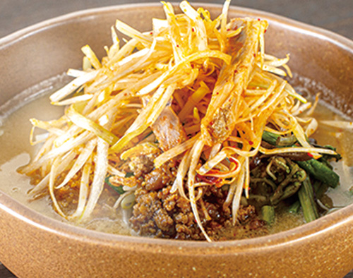 シャキシャキもやしとミンチ肉を乗せた、ピリッとほんのり辛い、唐辛子の風味のラーメン。優しい甘味と濃厚なうま味がクセになる。