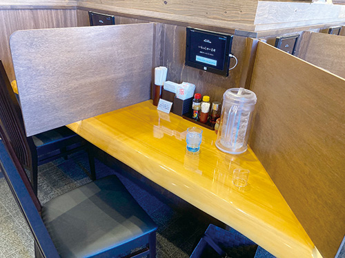温もりのある照明に落ち着きのある店内装飾。カウンターには仕切りがあるので、隣を気にすることもない。ヘアゴム、紙エプロンを用意してもらえるのもうれしい。