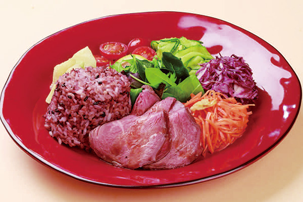 あっさりとした鶏の胸肉に、国産米を使って醸造した黒酢入りトマトソースで仕上げた、減塩メニュー。