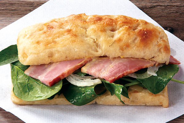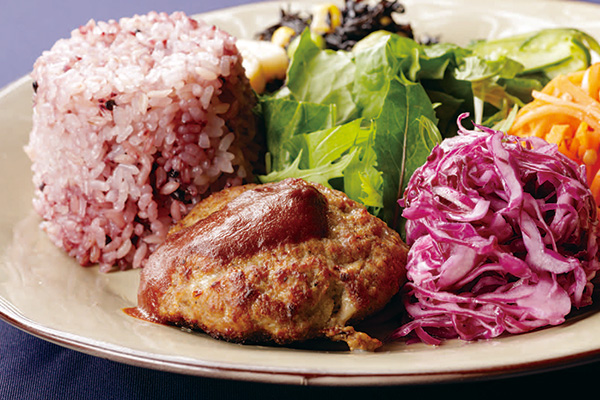 1日の野菜摂取目標量(350㌘)の約半分の野菜を使用したデリとサラダに、もち麦入りごはんがセットになっています。主役のハンバーグは、赤ワインベースの特製ソースを使った風味豊かな味わい。
