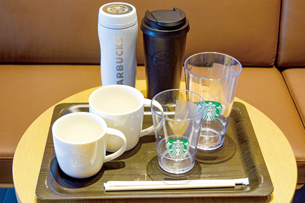 店内利用の際はマグカップ、樹脂製グラス、紙ストローで提供。もちろん、これまで通りプラスチックやペーパー製カップの選択も可能。マイタンブラーやカップ持参で20円引きに。環境のためにできることから始めよう。