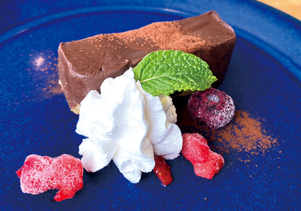 店で手作りした食後のデザートや、ちょっとした休憩にぴったりなハーフサイズのケーキ。種類はベイクドチーズケーキと生チョコケーキ。砕いたタルト生地に生チョコをのせた濃厚でしっかりとした味わい。