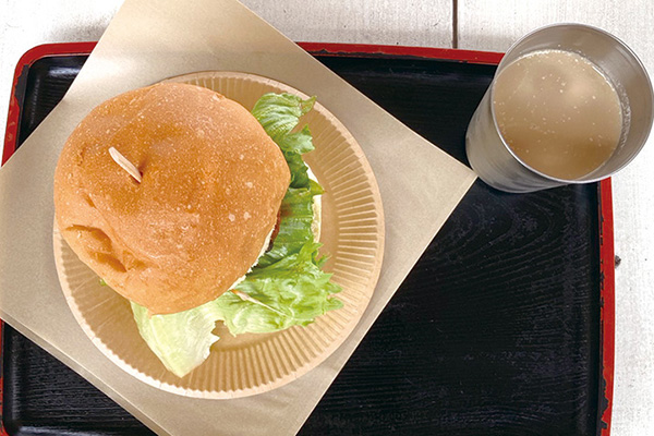 たっぷりの野菜や厚みのあるパティ、濃厚なチーズが入ったこのバーガーは、崩れ防止に串が刺さっているほどの大きさ。ナイフとフォークを使って食べるもよし、袋に入れてかぶりつくもよし、食べ方は自由。牧場前のテーブル席はゆったりとしたスペース。のんびりと牛を眺めながら味わう。このチーズもパティも牛からの恵み。