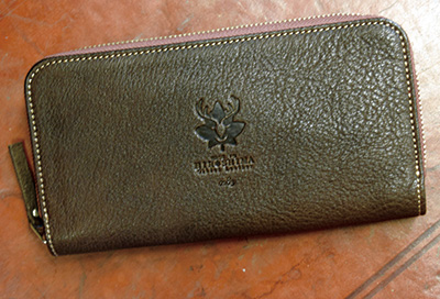 滑らかに開け閉めできるファスナーにもこだわった長財布。もちろん収納力も充実。外は鹿、内側は牛革を使用。シリアルナンバー入り。