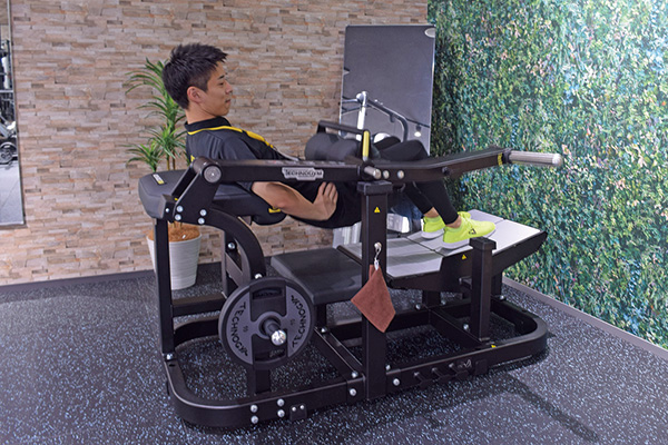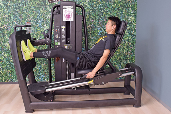フットプレートで足を押し上げていく。足全体をトレーニング。下半身が鍛えられる。