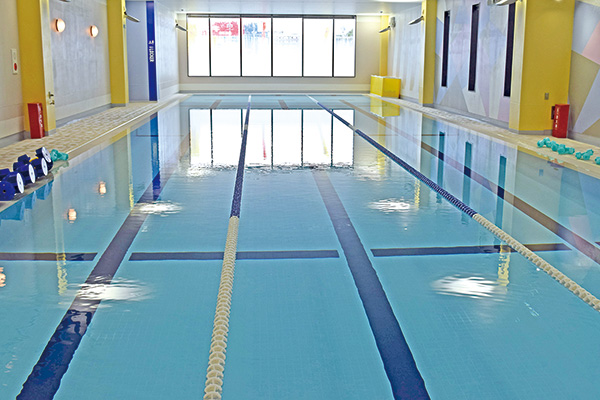 25㍍×3レーンのプール。各レーンの横幅は2.2㍍と広めで、水深は1.1㍍なので水中ウオーキングにもちょうどいい。水温は30.0~31.0度で管理され、水をろ過して常にきれいな状態にしている。
