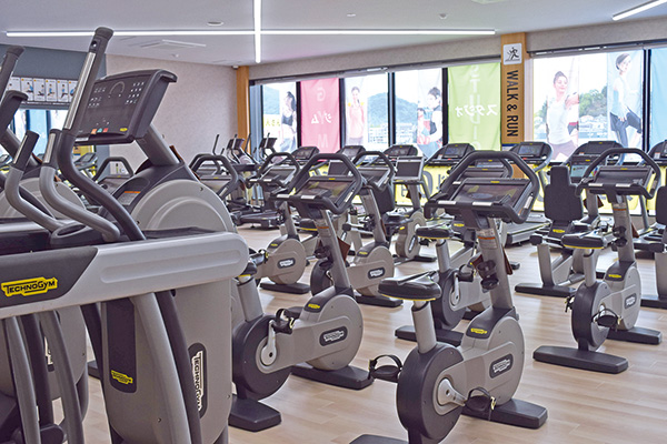 それぞれのマシンには、専用の小型テレビが付いているので、動画を見たり音楽を聴いたりしながら、飽きることなく運動ができる。
