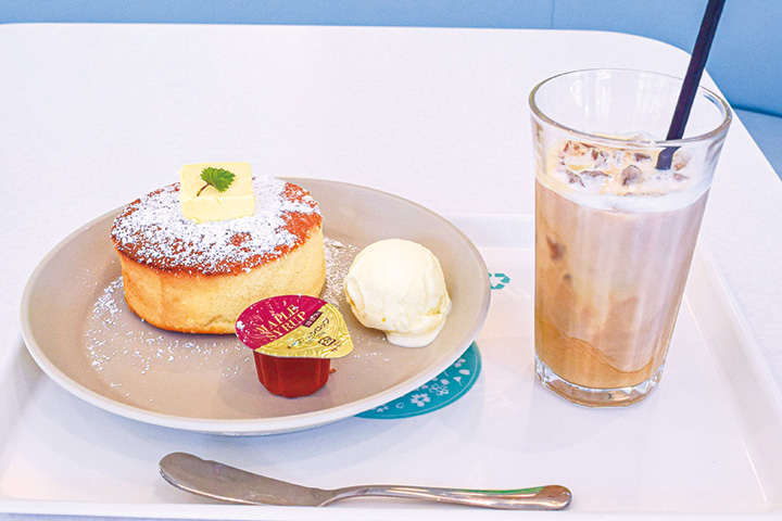 絵本の中から飛び出したような見た目のパンケーキ。厚さ約3㌢。ナイフとフォークでいただこう。スポンジケーキとカステラ、二つを同時に食べているような味わい。そのままでもおいしいけれど、上に乗っているバター、プレートに添えられたアイスで、いろいろな味の変化が楽しめる。メープルシロップはお好みで。