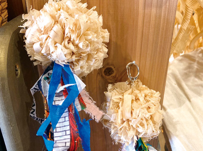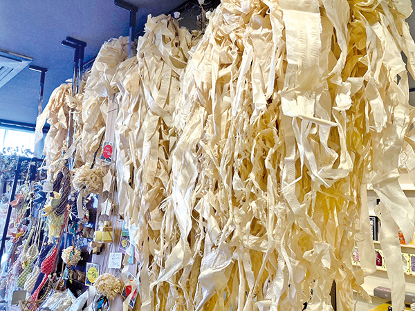 カンナくずとはカンナで木材を削るときにできる薄い木くず。「長さも太さも動きもバラバラ。それが魅力」と話す末藤さん。木材店ならたくさんあるのではと探していたところ、呉市の菊本木材が協力。譲ってもらったカンナくずを使って作品を生み出す。地球にやさしいカンナインテリア、アイデアはまだまだ止まらない。