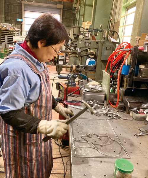 鉄工所を営む旦那さんと一緒に工場を支えてきた。「最初は何も分からず、しんどいと思うこともあった」と話す福原さん。しかしそれを乗り越えてきたから機械も触れた、溶接もできた…今までやってきたことが作品作りに大きく役立ったそう。レーザー加工は息子さんも手伝う。イベント時の搬入は家族みんなが協力。