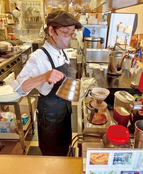 モーニングセットのコーヒーも1杯ずつドリップ。「コーヒー屋のこだわり」と話すマネージャーの釣流恭子さん。ミックスジュースもオーダーを受けてから作る。ミックスジュースはセット価格にプラス100円(単品550円)。次はミックスジュースを飲んでみようかな。