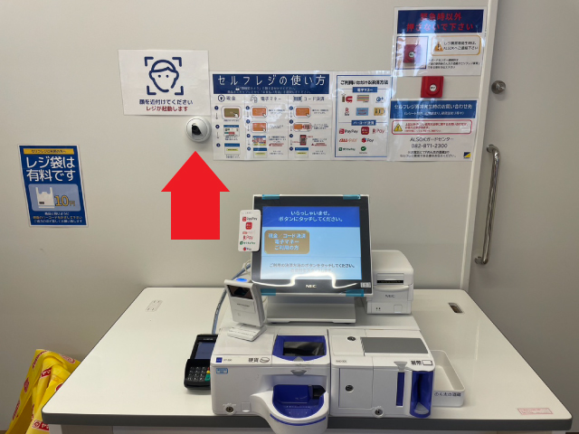 商品を選びレジへ。カメラ(写真の赤い矢印)で顔を認証させ、画面にしたがって操作していきます。