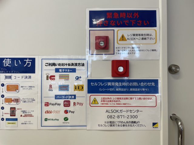 セキュリティー対策として、店内には防犯カメラや非常通報装置が設置されています。火災や不審者等緊急の場合は非常通報装置を。レジトラブルの際はALSOKガードセンターへお電話を。