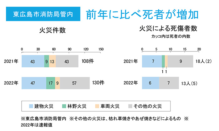 東広島市消防局管内では2022年、前年より22件多い130件の火災が発生した。大切な命や財産を火災から守るために、日ごろから防火意識を高めておきたい。特に春は空気が乾燥し風が強いため、全国的に火災が多発する。火災を防ぐために知っておきたい話題を集めた。(生活取材班)