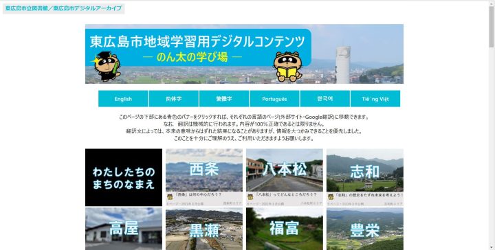 また、EVRIと東広島市立図書館が共同開発した「東広島市地域学習用デジタルコンテンツ のん太の学び場」は、市内各地域の特色をはじめ、交通、産業、福祉、国際交流などを、動画を交えながら解説しています。