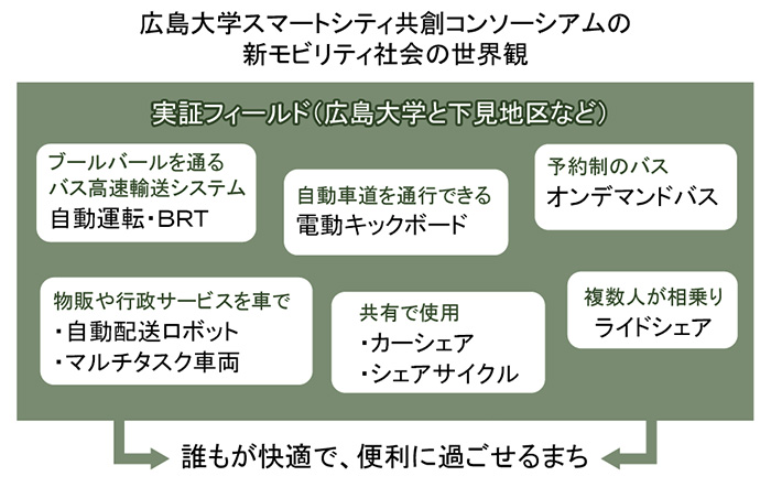 構想を推進する共同事業体「広島大学スマートシティ共創コンソーシアム」は、下図の12団体・企業で構成。コンソーシアムが目指す世界観の一つに「自家用車がなくても移動しやすいまちづくり」があります。