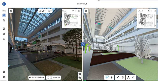 建設業のフジタが中心となって360度カメラで撮影したキャンパスや校舎のデータを使用し、その場のパノラマ画像が見られるシステムを開発中。今後、建設業で使われているソフトウエア「BIM(※)」で、バーチャルキャンパスを作り、構想に関わるプロジェクトの疑似実験を行います。