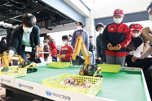 共創コンソーシアムに参画する企業が取り組んでいることや技術を知ってもらうことが目的。4足歩行ロボットの実演やエアロバイクによる発電体験など、子どもから大人までが興味深く見たり体験したりしていました。