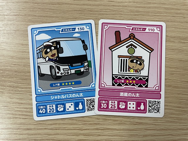 カードには「レア度・エネルギー・行動力・休息・じゃんけん・サイコロ・酒マーク・二次元コード」が書かれています。東広島観光協会のホームページでは、”小さいお子様も遊べるようにいろんなマークがあるので、遊び方は自由に考えて遊んでね”と紹介されていました。やってみたい…!まだ手持ちが2枚なので、もう少しのん太カードを集めてみようと思います。