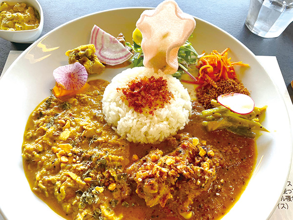 「レストラン カズマルヤマ」内に、間借りカレー屋としてランチタイムのみ営業。3種類のスパイスカレーから2種または3種を選びます。テイクアウトも可能。