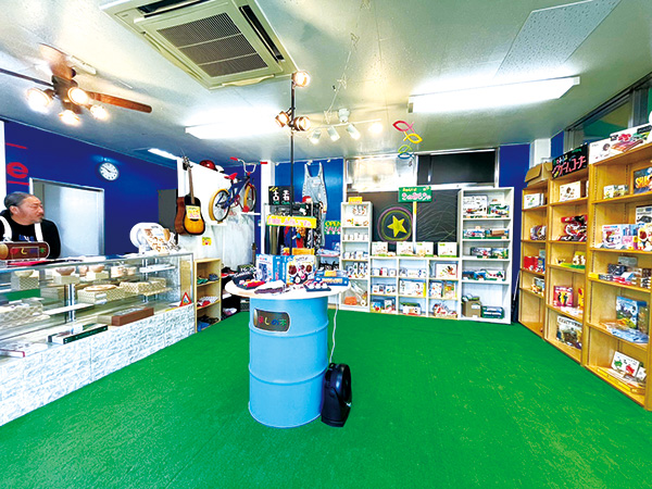 木のおもちゃ、ボードゲーム、多肉植物、古着などを販売。店内にはおもちゃで自由に遊べるプレールームがある。カラフルな外観や内装はオーナーがリフォームした。