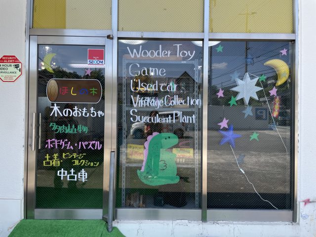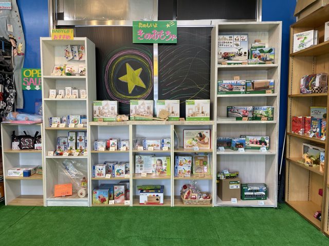 オープンのきっかけは、木とオモチャと雑貨のお店 「おやこにいいものくるり」(高屋町中島)が今年3月に閉店すると知り、それなら・・・と、商品を全て引き取り、「ほしの木」をオープン。店舗はオーナーの大杉さん自らの手作りだそうです。