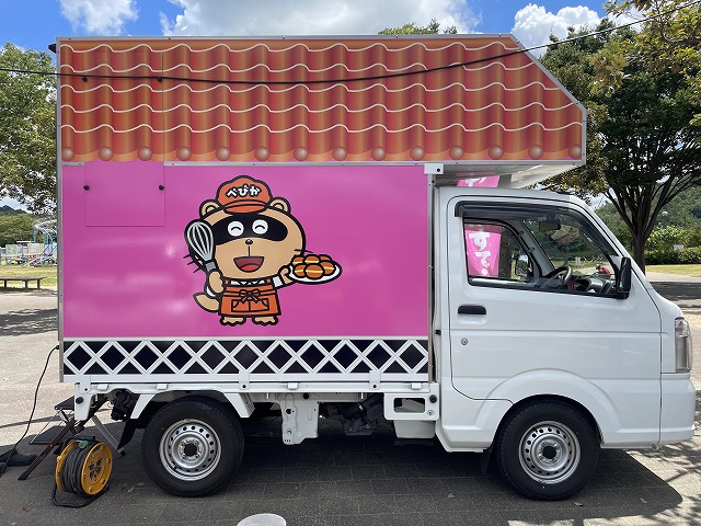 7月15日にオープンしたばかりの「のん太のべびか」へ行ってきました!この日は道の駅湖畔の里福富に出店されていました。ピンクと白壁・赤瓦のデザインが目印のキッチンカーです。東広島市観光マスコットキャラクター「のん太」が何かを持っている様子が描かれています。何を販売されているのかというと…