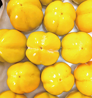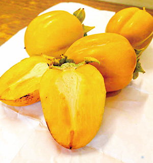 口の中いっぱいに広がる甘さと緻密な果肉の食感に、ファンが多い西条柿。東広島市西条が原産で、今が収穫期。秋晴れの畑では、風に吹かれて葉がささやき、パチンパチンというはさみの音が聞こえる。
