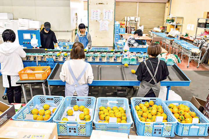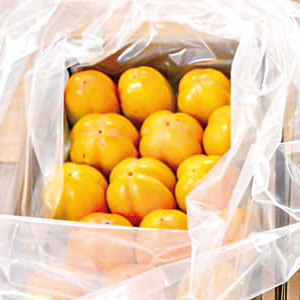 選果場で等級ごとに分けられた西条柿は、渋を抜くためのドライアイスと一緒に袋に詰められ配送される。渋が抜けた西条柿は甘く、糖度は約18度。「酒のつまみにもええよ」と松川さん。