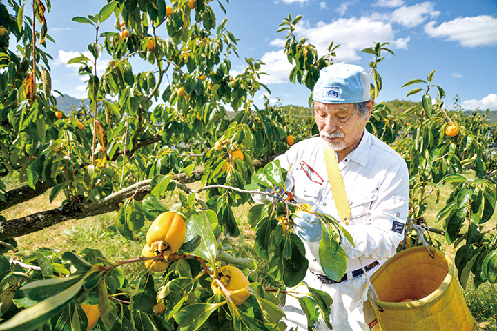 収穫が終わった後も枝切り、草刈り、つぼみや花を間引く作業など、年間を通して手入れをする。継続の原動力は、「実のなり方を想像しながら行う枝切りには苦労するけど、木の成長を見るのが楽しみ。出荷して『いい柿だね』と言ってもらえるとうれしいよ」とにっこり。