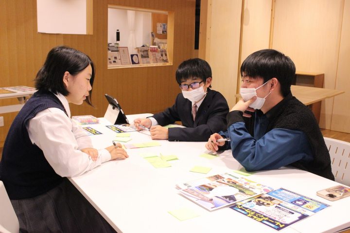 ワークショップのテーマは【のん太のトレーディングカードのミッションとデザインを考えよう】。学校や学年も違う学生が3つのグループに分かれ、カードを集めるためのミッションを考えます。東広島市の観光スポットや特産物、施設や学校行事などを、パンフレットやタブレットを使って調べ意見を出し合いました。