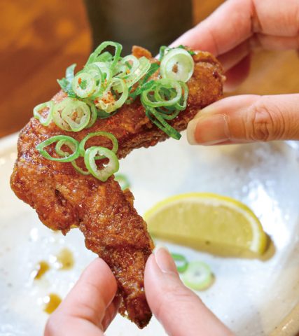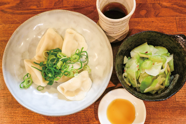 紹興酒で一層〝中華の口〟にしたら、まずは早つみザーサイと水餃子を注文。つるんとした水餃子は、たれをつけなくても満足のしっかり味。もちもちの皮と合うよう、餡(あん)にはえびが練り込まれているのだとか。たれを少しつけてみると、ふわっと大葉の香りが。一口目には感じなかったのにと思ったら、たれに青じその風味が加えられていた。憎い、憎いたれだ。さっぱりしていて水餃子がするすると入ってしまった。お酒も進み、続いて「紹興貴酒」3年をいただく。箸休めのようないで立ちのザーサイもあなどれない。見た目にも若さが伝わってくる爽やかな緑色。さらに浅漬けにしてあるのでさっぱりと、シャキシャキいただける。味の濃いものも欲しくなって手羽先揚げを注文。1本から注文できるのがうれしい。手羽先は、甘辛さをまといながらもカリっとじゅわっと。一味でぴりっとを足してもまたいい。