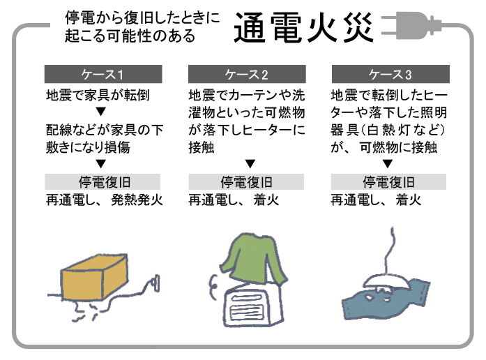 通電火災の場合、住民が避難所などへ避難していると初期消火が行えず、被害が拡大することも考えられる。「命や財産を火災から守るためにも、家具の転倒防止策などを行い、いざというときの行動を家庭や職場で確認してほしい」と東広島市消防局。