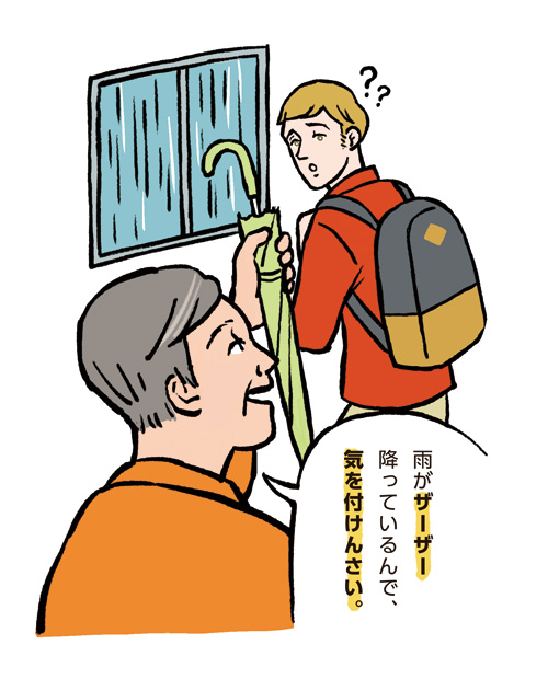 心情を伝えるために、ジェスチャーと同時に無意識に擬音語や擬態語を使うことが多い。擬音語は「ザーザー」のように音を表す言葉。擬態語は「つるつる」など様子を表す言葉。これも理解が難しい。