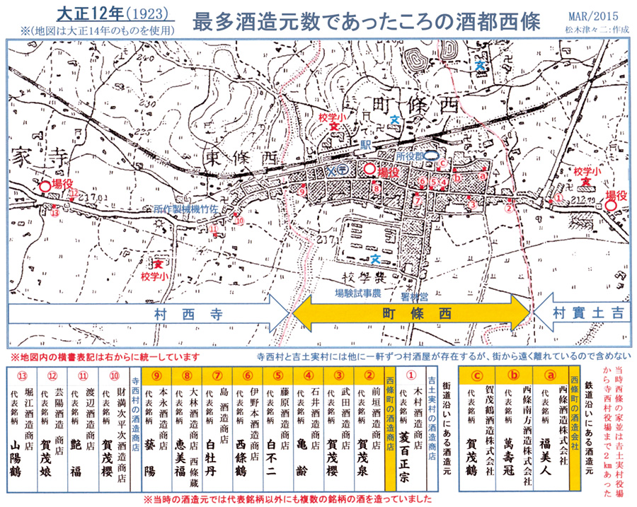 昔の街道筋に2㌔㍍にわたって、最大時は13軒の造り酒屋が並び、その街並みの北側には、鉄道に沿って3社の酒造会社の工場群が建ち並ぶ。昭和4(29) 年には街の中に県醸造試験場が移転して来て、街の南にある県立農学校に隣接した県農事試験場の試験農場では、酒米の研究が行われ、この市街地に精米機の製作所が三つもできます。戦前の日本の酒造業をけん引した日本酒造りの首都(中心地)=「酒都西條」は、こうして誕生したのでした…(しかし戦後になって酒都の概念は消える)。