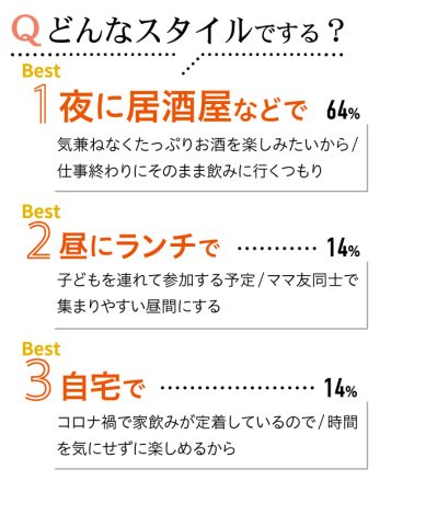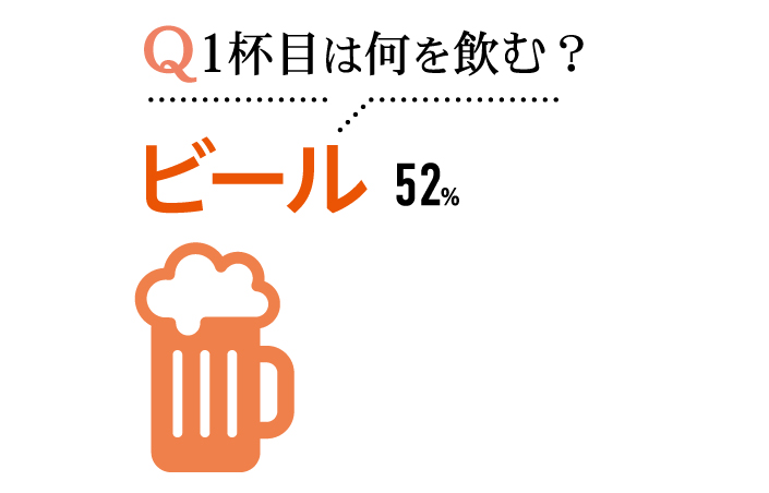 半数の人はビールで乾杯。ソフトドリンク・ノンアルコールを飲むと回答した人は約3割。乾杯条例があるので「西条酒」という回答もあった。